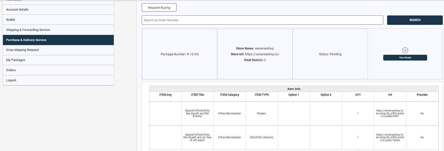 Your buying request details can be located under ‘My Account’ in the ‘Purchase & Delivery Service’ section.